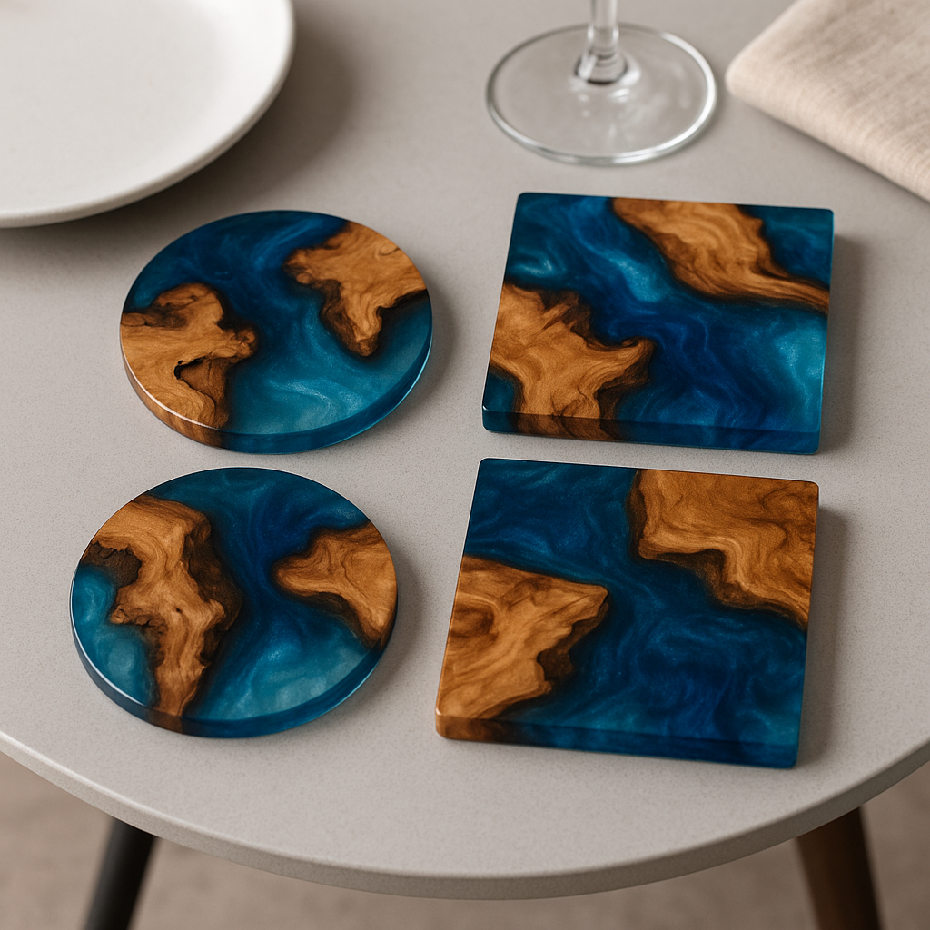 このレジンコースターセットは、天然木と鮮やかなブルーのレジンが融合した、高級感あふれるデザインが特徴です。丸型と四角型の2種の形状がセットになっており、テーブルにアクセントを加えながら、しっかりと表面を保護します。